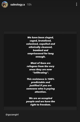 Another post shared by Azar weeks later came from the Instagram account of Gazangirl, stating “This resistance is 100 percent predictable and justified if you are someone who is paying attention.” This post expired after 24 hours, but Hetzel shared his screengrab with TPS-IL.