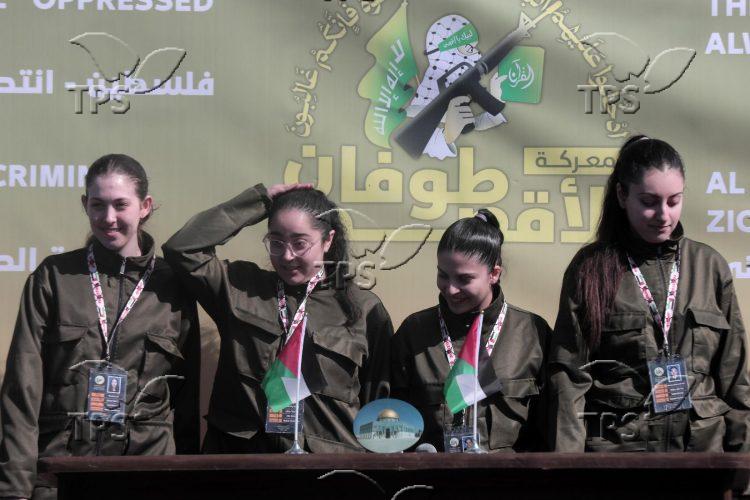 On Saturday afternoon, Liri Albag, 19, Daniella Gilboa, 20, Naama Levi, 20, and Karina Ariev, 20, were made to wear olive green clothes resembling army uniforms and brought to a stage in Gaza City featuring signs with slogans such as “Palestine: The victory of the oppressed people vs the Nazi Zionism.”