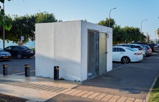 A portable lifesaving bomb shelter (Migunit) is placed in a public area in Haifa to protect citizens from missile attacks. Haifa, Sep 26, 2024. Photo by Sharon Leibel/TPS-IL