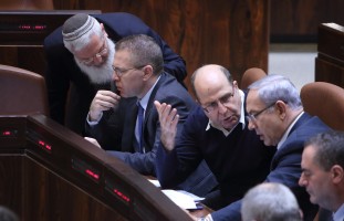 From right to left: Minister of Transportation Israel Katz, Prime Minister Benjamin Netanyahu, Defense Minister Moshe Yaalon, Public Security Minister Gilad Erdan (all Likud) and Deputy Minister of Defense Eli Ben Dahan (Jewish Home).