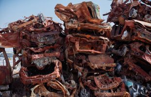 Moshav Tekuma, where cars wrecked during Hamas' October 7 attack were towed, on Oct. 30, 2024. Photo by Sharon Leibel/TPS-IL