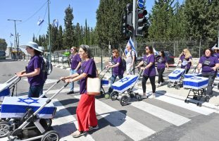 Anti-government protest at the entrance to the Bakum at Tel haShomer army base in Ramat Gan as part of the National Equality Day across Israel. Women with strollers carrying caskets covered with the national flag of Israel demand equality in the burden of military service. Ramat Gan, May 4, 2023. Photo by Yossi Zeliger/TPS-IL