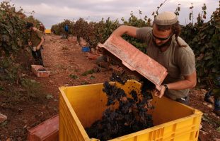 Farmers harvest grapes at a vineyard in Yitzhar in northern Samaria on Sept. 17, 2024. Photo by Ehud Amiton/TPS-IL