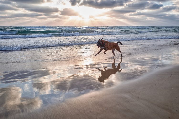 Jerusalem, 18 August, 2025 (TPS-IL) -- A dog playfully runs along Haifa’s beach on Aug. 18, 2025. Photo by Sharon Leibel/TPS-IL