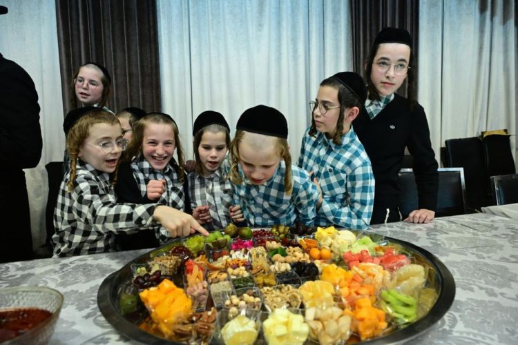 Jerusalem, 3 February, 2026 (TPS-IL) -- Children look over fruit platters at a Tu B’Shevat celebration in Rehovot on Feb. 2, 2026. The holiday — which marks the beginning of the trees’ new fruit-bearing cycle — is celebrated eating fruits associated with the land of Israel, planting trees, and events stressing ecological awareness. Photo by Yossi Zeliger/TPS-IL