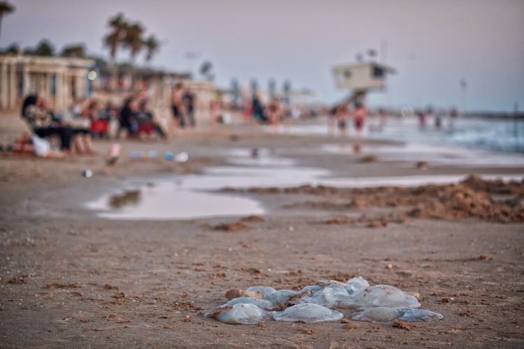 Jerusalem, 6 July, 2025 (TPS-IL) -- Jellyfish lie in the sun on a Haifa beach on July 4, 2025. Every summer, swarms of jellyfish drift into Israeli waters from the Mediterranean, disrupting beachgoers and clogging desalination plants — a seasonal phenomenon linked to warming seas and changing marine currents. Photo by Sharon Leibel/TPS-IL