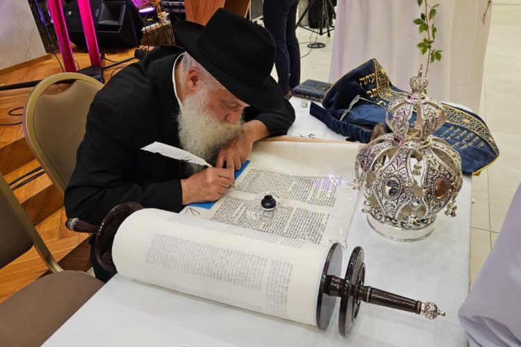 Jerusalem, 11 September, 2025 (TPS-IL) -- A rabbi in the Israeli city of Netanya carefully writes the final words in a new Torah scroll on Sept. 10, 2025. Every single letter must be written correctly, without touching another letter or being malformed — if even one letter is missing or invalid, the Torah is considered unfit for use. Photo by Yaron Blustein/TPS-IL