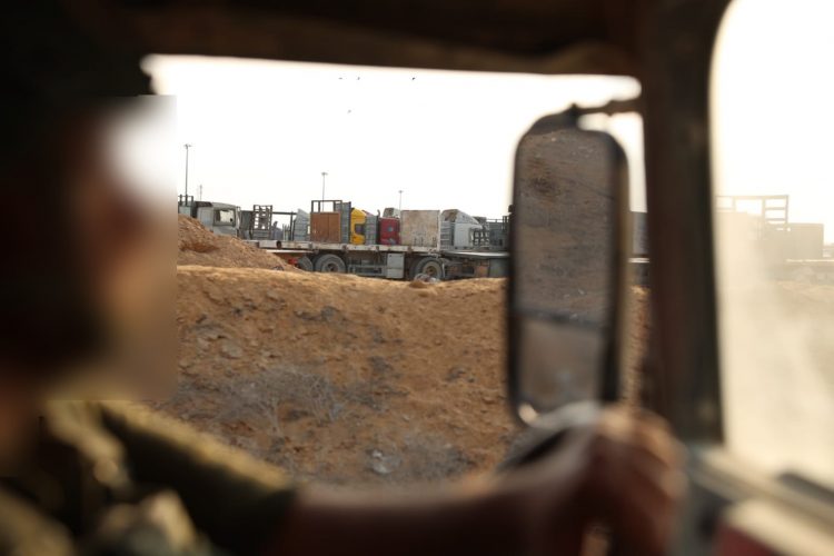 Jerusalem, 13 November, 2025 (TPS-IL) -- An Israeli military vehicle drives past humanitarian aid trucks in the Gaza Strip’s Philadelphi corridor in November 2025. The Philadelphia Corridor is a buffer zone that runs the length of the 14 km Gaza-Egypt border created in 2006 to prevent weapons smuggling. Photo by TPS-IL