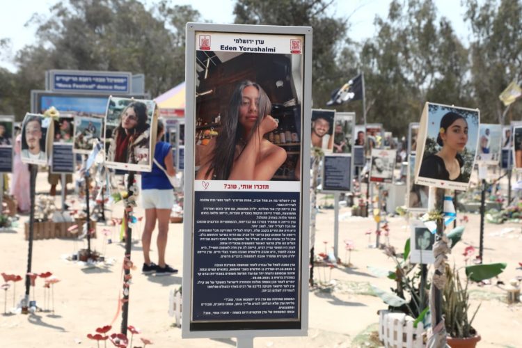 Jerusalem, 19 August, 2025 (TPS-IL) -- A quiet moment at the memorial to victims of the Nova Music Festival massacre by Kibbutz Re’im on Aug. 18, 2025. Hamas terrorists killed 364 people and abducted 44 more on October 7, 2023. The sign in front is Eden Yerushalmi, who was murdered in captivity at the age of 24. The anniversary of her death on the Hebrew calendar fell on Aug. 19. Photo by Gideon Markowicz/TPS-IL