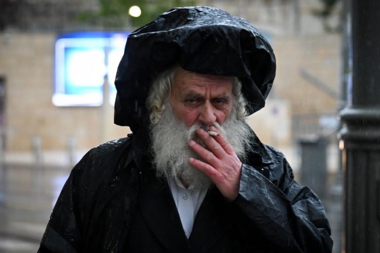 Jerusalem, 13 January, 2026 (TPS-IL) -- Heavy winter rain didn’t stop an Israeli man from dragging a cigarette in downtown Jerusalem on Jan. 13, 2026. Photo by Yoav Dudkevitch/TPS-IL