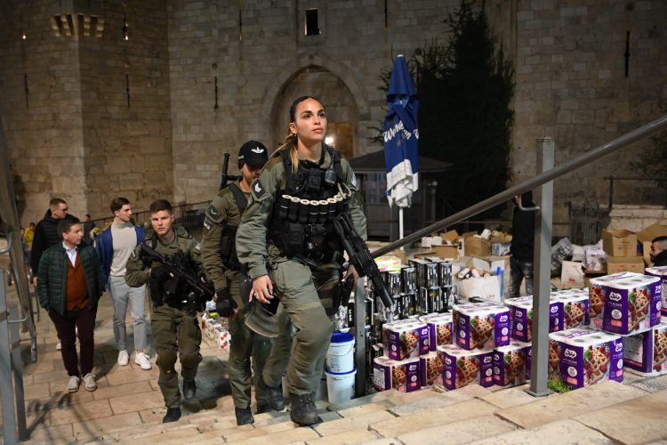 Jerusalem, 11 March, 2024 (TPS-IL) -- The Israel Police increased security in Jerusalem during the Muslim holy month of Ramadan. Here police can be seen at the Damascus Gate entrance to the Old City of Jerusalem at the end of the first full day of the month in which devout Muslims fast during the daytime.