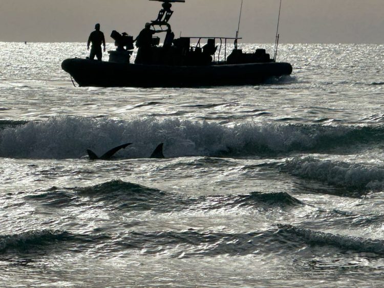 Jerusalem, 21 April, 2025 (TPS-IL) -- Sharks can be seen near a police boat that responded after a suspected shark attack off the Israeli coastal town of Hadera on Monday prompted the closure of several nearby beaches, as police and emergency responders continue a large-scale search for a missing diver. Although no body has been found, eyewitness accounts describe a violent scene.