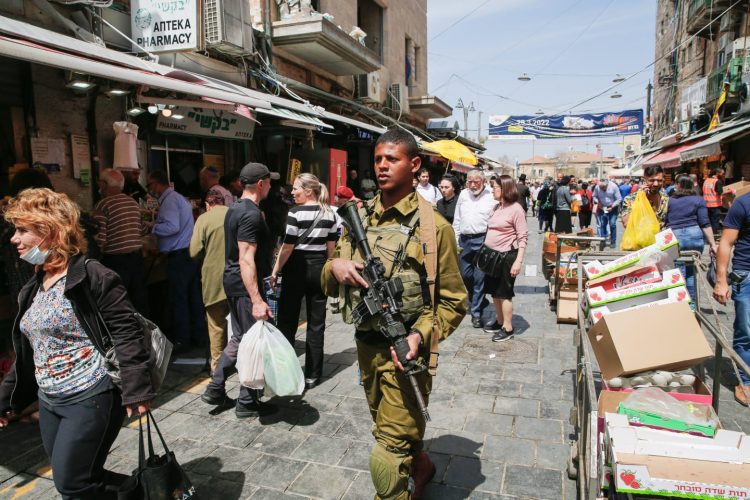 Jerusalem, 1 April, 2022 (TPS-IL) -- Israeli soldiers patrol the famed Mahane Yehuda market – the Shuk – in central Jerusalem as part of the government’s program to increase security in public areas in light of the wave of terrorist attacks which has seen 11 Israelis murdered over the past 2 weeks.
