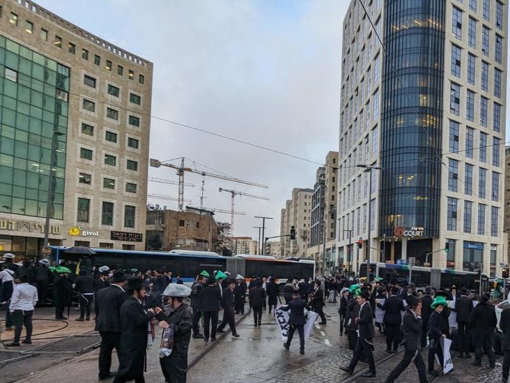 Jerusalem, 19 March, 2024 (TPS-IL) -- Hundreds of ultra-Orthodox Israelis block a main intersection on Jaffa Street near the Jerusalem central bus station, protesting against an end to the indefinite military service deferments they enjoy by studying in yeshivas (Tora study academies).