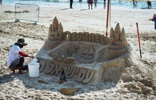An Israeli artist works on a sand sculpture at the "Dreams of Sand Festival in Haifa on Aug. 7, 2025. Photo by Sharon Leibel/TPS-IL
