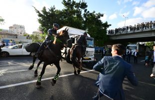 A mounted police officer charges through a crowd of Israeli Haredim blocking traffic in Jerusalem during protests against plans to draft ...