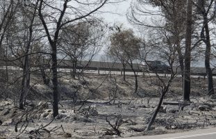 The blackened remains of an area of the Jerusalem Hills scorched by recent wildfires on May 4, 2025. Photo by TPS-IL