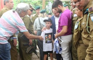 Mourners console eight-year-old Alon Hamami at the funeral of his father, Col. Asaf Hamami in Kiryat Shaul on Nov. 4, 2025. Col. Hamami was ...