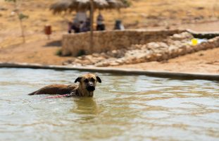 A dog playfully runs along Haifa's beach on Aug. 18, 2025. Photo by Sharon Leibel/TPS-IL