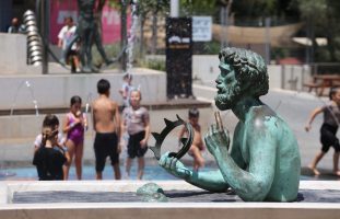 Family and friends playfully splash water on Israeli teens reporting to Tel Aviv's Tel HaShomer army induction center during a heatwave on ...