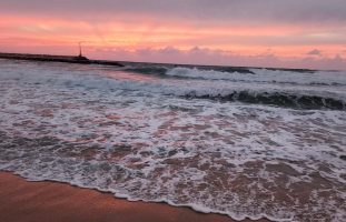 Israelis in Haifa enjoy Mediterranean waves and a brilliant sunset on Aug. 18, 2025. Photo by Sharon Leibel/TPS-IL