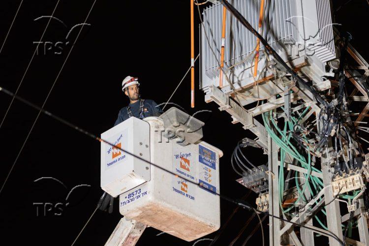 Israel Electric Corp. crews repair power lines in Kiryat Shmona that were damaged during a Hezbollah barrage on Feb. 13, 2024. Photo by Erez Ben Simon/TPS
